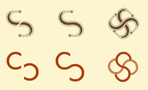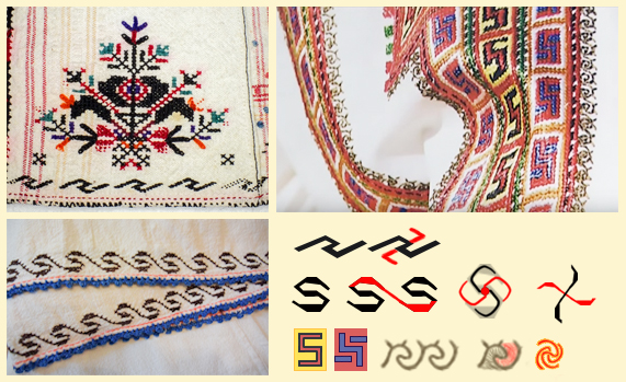 | Първи ред N1 капанска шевица (ръкав) от село Осенец / фотография Антон Анастасов Втори ред N1 добруджанска шевица (ръкав) / фотография Дима Тодорова Първи ред N2 българска шевица (ръкав) показана от Елица Димова Втори ред N2 са показани вихровите елементи по отделно и как те взаимодействат, за да образуват свастика |