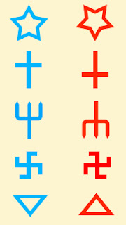 Ето някой от графичните символи, които съществуват в реверсивни вариации : пентаграм, християнски кръст, тризъбец, свастика, триъгълник. Те могат да бъдат огън и вода, война и мир, смърт и живот, земя и небе, мъж и жена, слънце и луна. Когато са изобразявани една до друга, фигурите се хармонират. Ако те се слеят се получава нов комплициран символ. Обикновено тези усложнени символи представляват самата структура на вселената. За да се разбират правилно и да бъде осъзнато предназначението им те не трябва да се отричат. Отричането или заличаването им не ги унищожава, тъй като тези пиктограми се съдържат в самата природа. Те са буквално навсякъде. Неразбирането ни как работят те поради отричане или заличаване, всъщност не ни защитава, а ни прави уязвими. Незнанието е тъмнина, а именно там сме най-незащитени. Не е нужно да позволяваме на страха да ни контролира. Страхът съществува и се ражда там, където е тъмнина, сиреч незнание.