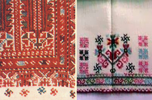 | 1.Рамо на женска риза със свастики и сувастики от Врачанско 2. Дървото на живота в структурата на знака IYI със свастики от капанска шевица от село Садина (област Търговище) |